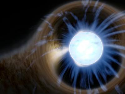 艺术家对磁星的构想,它被一个吸积盘包围,而磁星因广义相对论的影响而摇晃或进动。...