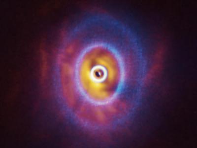 三星系统的GW-猎户座中环绕恒星的星盘由星盘撕裂造成(Image credit: ALMA / ESO /...
