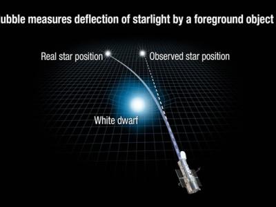 本示意图显示了一颗白矮星的引力是如何扭曲空间并将...