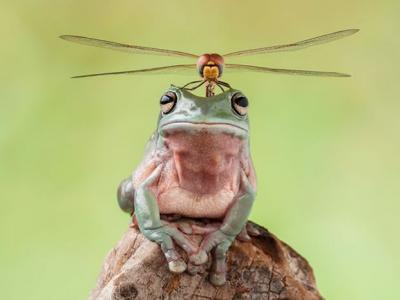 印度尼西亚Lessy Sebastian在自家花园捕捉到蜻蜓栖息在青蛙头顶画面,像一架直升...