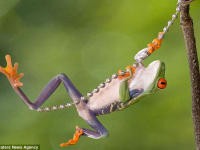 “蛙中泰山”:孟加拉国摄影师图拍摄萌宠青蛙“手”抓珠链林间飞荡照片 (神秘...