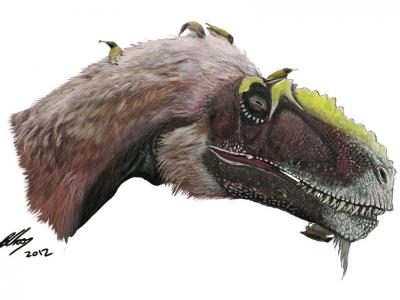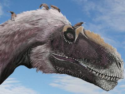 一群早期鸟类(Longirostravis)在帮它们的近缘类群之一的大型恐龙 (Yutyrannus)...