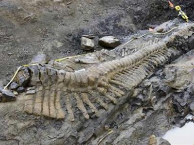 研究人员在墨西哥科阿韦拉州挖掘发现一具远古恐龙尾部骨骼化石 这是墨西哥境内...