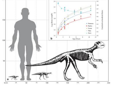 鹦鹉嘴龙生长曲线与行走姿态转变 (赵祺供图) 鹦鹉嘴龙幼年个体中前肢放射状...