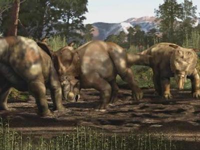 艺术家对Pachyrhinosaurus perotorum的渲染图显示了恐龙用头互相顶对方。 近日在...