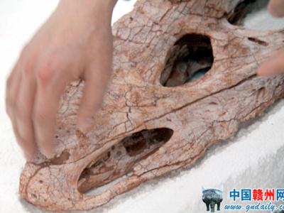 霸王龙头骨化石局部 董枝明教授在鉴定现场 赣州自然博物馆工作人员向记者介...