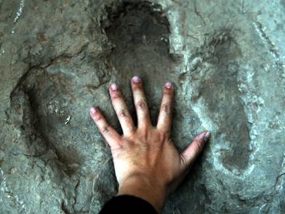 11月29日,在綦江老瀛山莲花保寨,记者将手放在恐龙足迹上拍照 来自韩国的恐龙...
