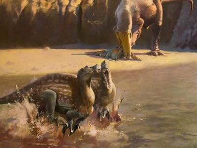 艺术家的想象图,索伦龙Sauroniops正在掠食年幼的棘龙,其余的棘龙四散奔逃 一种...