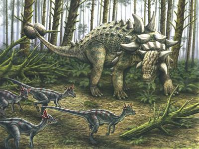 甲龙生活复原图 一亿四千多万年前,一头庞大的甲龙从这里步履沉重的走过,它万万...