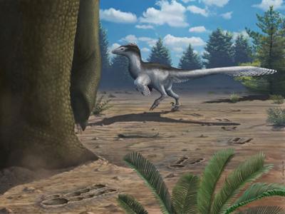 甘肃永靖恐龙足迹化石群复原图,恐爪龙类行走在蜥脚类恐龙旁边(绘图/艾米丽R...