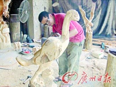 当地木雕师傅在雕刻“黄氏河源龙” 全球唯一以姓氏命名、首次在我国发现的窃蛋龙...