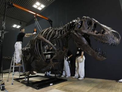 多名工人正在安装一头霸王龙化石的复制品 6月21日,日本东京的国立自然和科学博...
