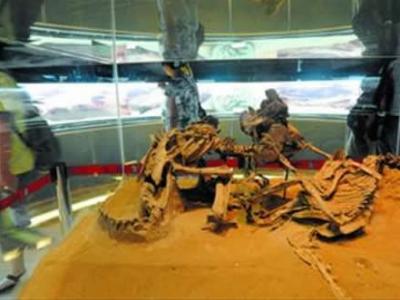 蒙古馆内的疾走龙和安氏原角龙化石 昨天,上海世博会迎来蒙古国家馆日,蒙古...