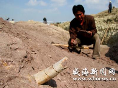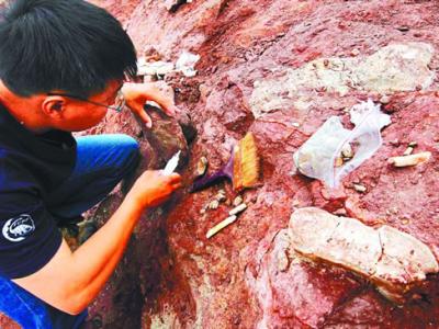 2号发掘地发现者于世明在看护恐龙化石发掘现场,不远处就有一段露出地表的化石。...