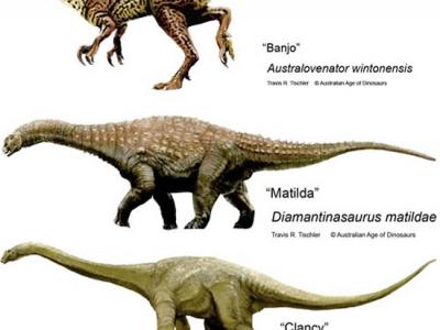 澳大利亚发现三个新恐龙物种化石,从上到下依次是食肉恐龙Australovenator,食草...
