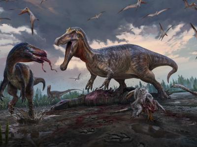 1.35亿年前,英格兰东南部的早白垩世洪泛平原:一只棘龙(中)占据了一只鸟脚亚目恐龙...