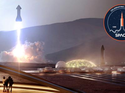 艺术家对火星上人类定居点的插图,背景为SpaceX星际飞船。(图片来源:uux.cn/Spac...