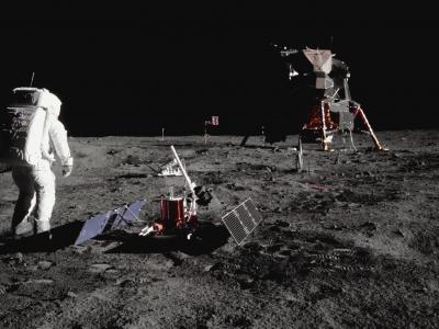 阿波罗11号任务期间,宇航员巴兹·奥尔德林在科学设备的环绕下在月球上行走(图片来...