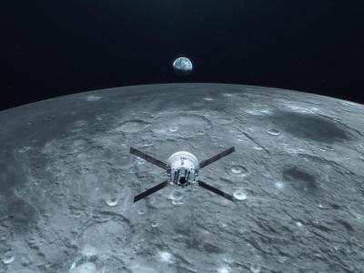 猎户座飞船飞越月球的插图,地球在远处可见。(图片来源:uux.cn美国国家航空航天局...
