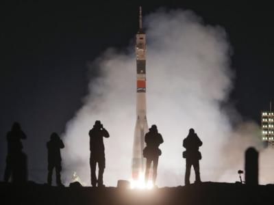 联盟号火箭正式升空。科克(左)、奥夫奇尼(中)和黑格(右)...