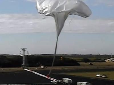 气球升空,把飞碟状飞行器送上高空。 飞碟状飞行器升空。 (神秘的地球报道)...
