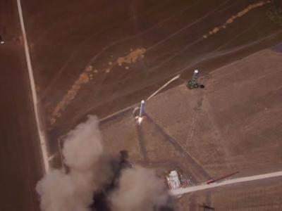 5月1日猎鹰9R火箭模型发射和着陆测试过程中的鸟瞰图 猎鹰9R的广角视图显示了助...