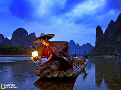 广西漓江鸬鹚捕鱼人 中国广西桂林市兴坪水寨,竹排上的渔民借助鸬鹚在漓江捕鱼。...