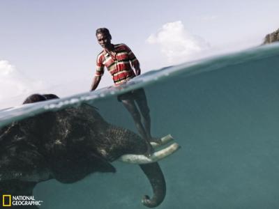 安达曼群岛哈夫洛克,养象人纳兹鲁带着他的大象“拉贾恩”(Rajan)在拉达纳加海...