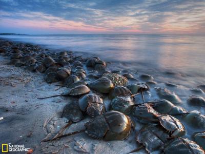 美国新泽西州五月岬德拉华湾成群的鲎黄昏