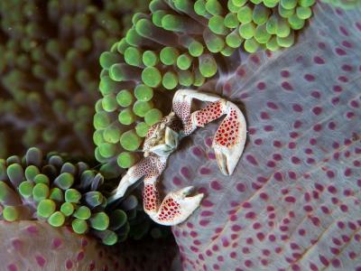 海葵上的脆弱瓷蟹 一只甲壳上长着红点的瓷蟹栖息在海葵上方。瓷蟹其实并不是真正...