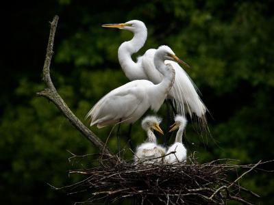巢中的白鹭一家 图片拍摄于美国南卡罗来纳州的默特尔比奇。春季是白鹭筑巢产卵的...