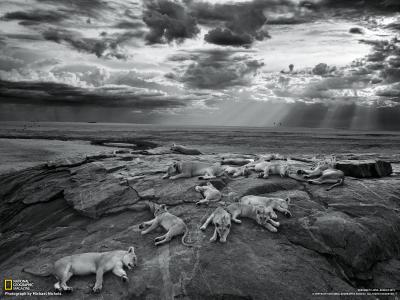 塞伦盖蒂大草原一群狮子 塞伦盖蒂大草原上,一群狮子正在水源附近一块露出地面的...