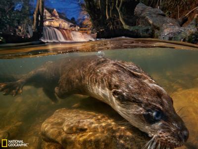 英格兰河流中欧亚水獭寻觅猎物