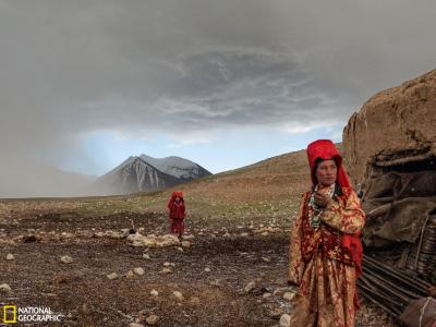 阿富汗吉尔吉斯族女孩 一场冰雹过后,两个吉尔吉斯族女孩走出土坯房。这是在阿富...