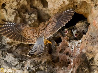 索科特拉岛红隼 红隼妈妈带着食物飞回建在悬崖上的巢穴。红隼以及包括秃鹰在内的...