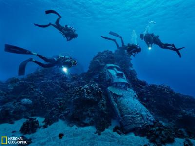 复活节岛的珊瑚礁海域潜水的游客遇到一具假的摩艾石像 在复活节岛的珊瑚礁海域潜...