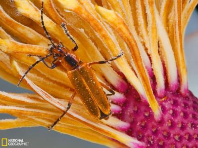 木兰花上的花萤 美国华盛顿特区的国家植物园,一只花萤正用力咀嚼木兰花。甲虫是...
