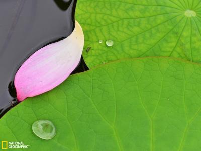 日本京都府立植物园,飘落的粉红色花瓣与绿色的荷叶形成鲜明颜色对比。
