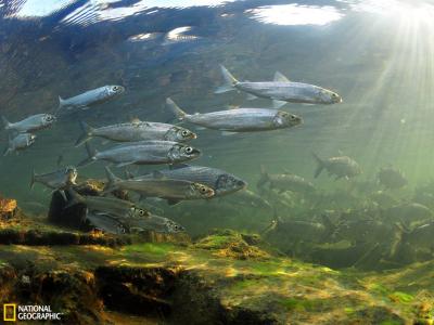 加拿大湖鲱 阳光穿透云层,照入宁静的湖水中。这是亚北极区的一片水下世界,很少...