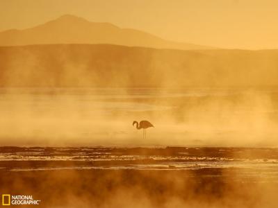 玻利维亚盐湖日出之时一只火烈鸟 2012年1月,摄于玻利维亚Termas de Chalviri盐...