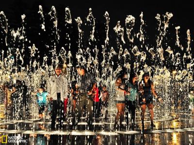 秘鲁的水公园 秘鲁的水公园在夜晚充满了活力,孩子和大人都在水中尽情玩耍。