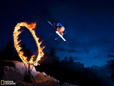 加拿大滑雪高手穿过火圈