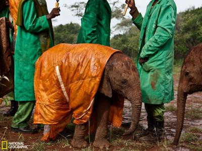 肯尼亚小象孤儿穿雨衣 肯尼亚大卫-施德里克野生动物园大象孤儿院的护工们为一头...