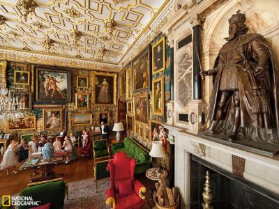 英国的詹姆斯国王雕像 伦敦北部哈特菲尔德宫的一个房间,墙壁上挂满名画,一座真...