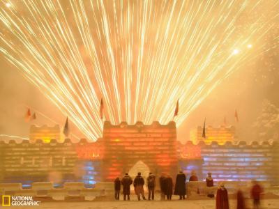 美国纽约萨拉纳克湖冬季嘉年华 美国纽约萨拉纳克湖冬季嘉年华现场,绚丽的烟花既...