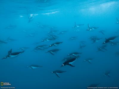 一群巴布亚企鹅振翅游过德里加尔斯基峡湾