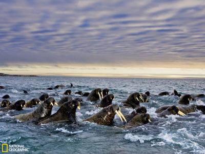 一群巴布亚企鹅振翅游过德里加尔斯基峡湾附近海域