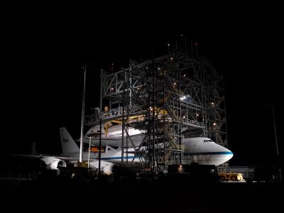 结束的STS-126任务的奋进号航天飞机被背回美国宇航局肯尼迪航天中心,准备从飞机...