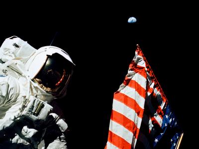 阿波罗17号宇航员哈里森施密特在月球上和美国国旗合影