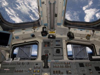 宇航员迈克尔在亚特兰蒂斯航天飞机内